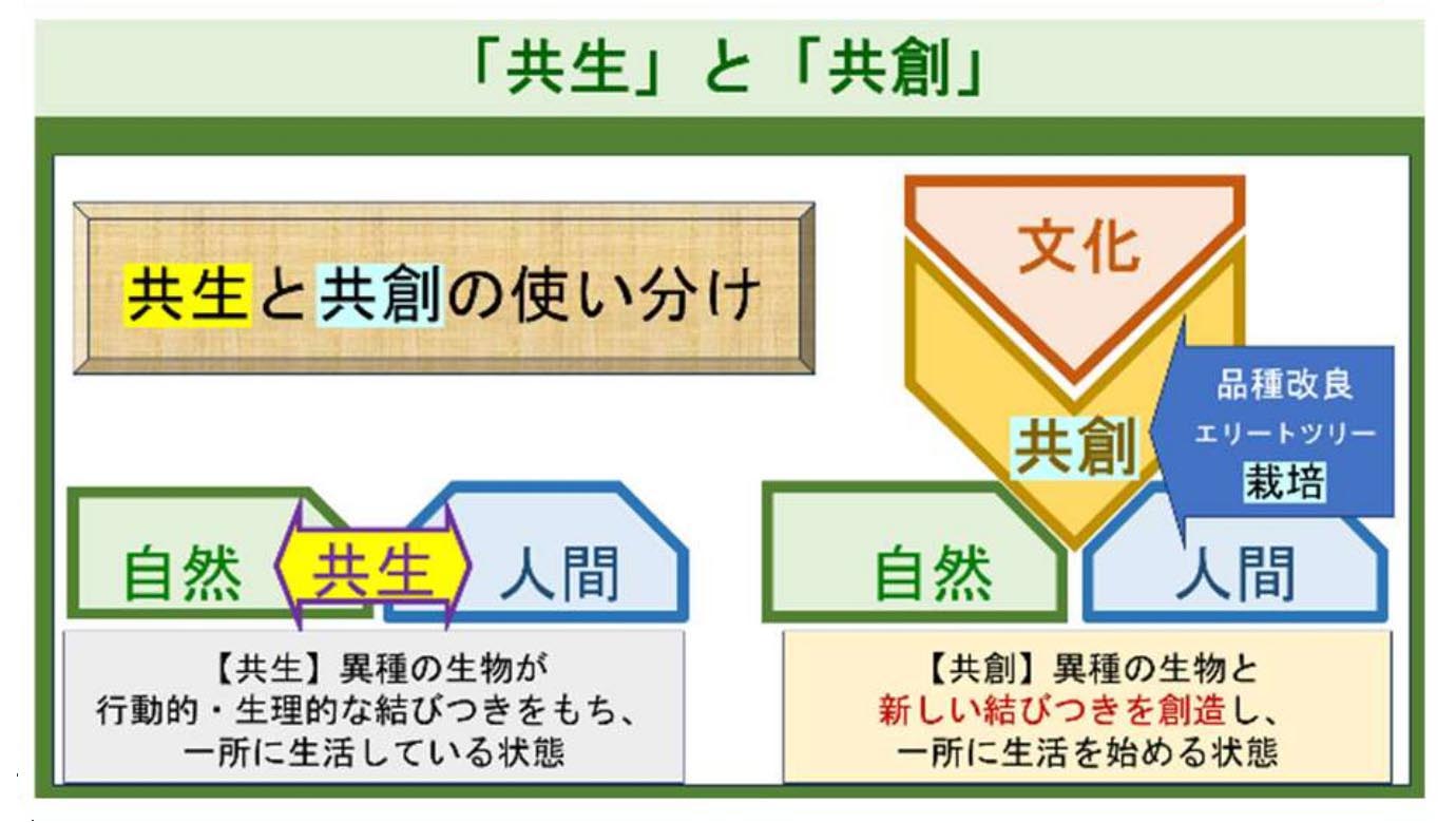 人間が文明の成果を自然界に持ち込むことにより異種の生物と新しい結びつきを創造し、一所に生活をする状態は「共創」と呼ばれています。実生苗の場合は「共生」、挿し木苗の場合は「共創」になります。「共創」の場合は、人間は絶えず文明的な状態や条件を維持し続けなければなりません。挿し木苗の人工林では間伐が必要です。