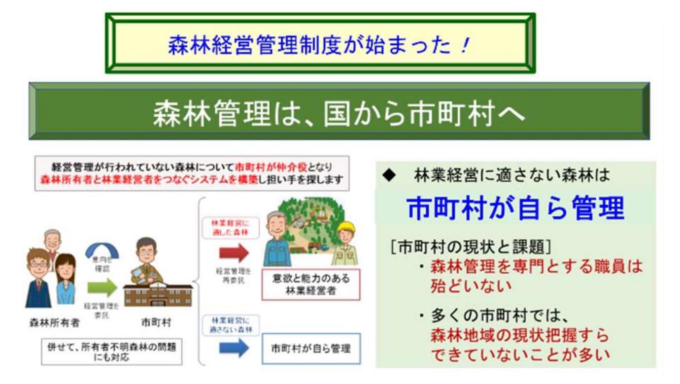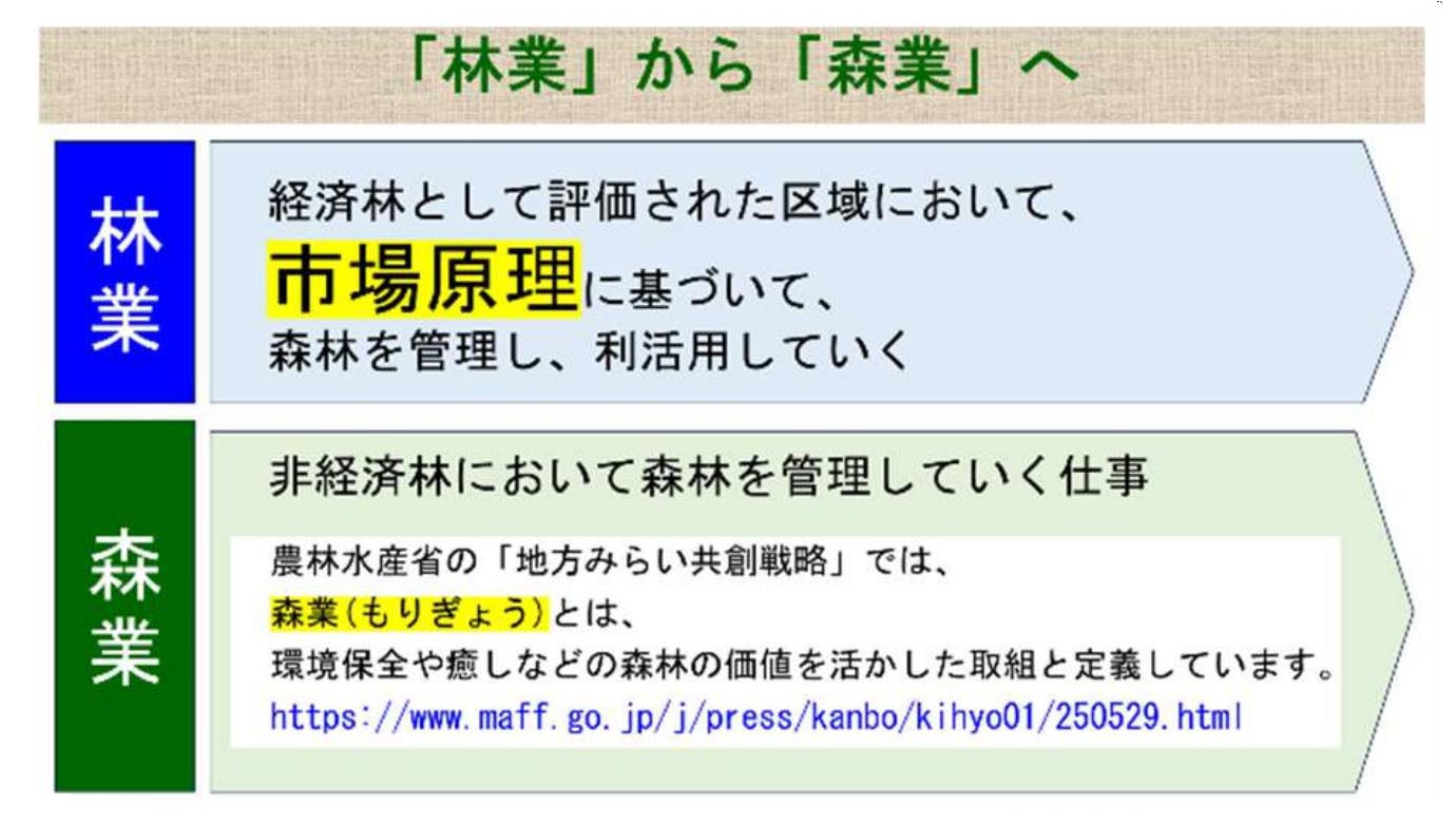 しかし、地球温暖化による気候変動などの影響に加えて、少子高齢化、過疎化などにより、手入れ不足の人工林も増えてきており、課題が山積しています。こうした状況を踏まえて、令和の時代から森林経営管理制度が始まり、森林所有者から委託を受けた非経済林は市町村が中心となって管理することになりました。そのための予算として森林環境税が徴収され、市町村などには森林環境譲与税が配分されています。これからの時代は、市町村が管理することにな4る非経済林や環境林も対象とした森林管理も求められており、木材を生産する「林業」に加えて、自然環境を保全して管理する「森業」も必要です。さらには、森林資源を有効利用することによって、地域振興を図ると共に、化石燃料の使用を抑制することも重要な課題です。